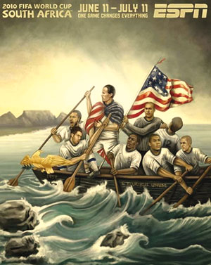 美国队的海报以船只为主题,然而船上的球员们却一副忧心忡忡的表情,似乎担心大家随时会翻船。不知道这是不是代表了绘画者不看好美国队能在小组赛中出线?