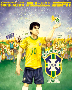 在巴西队的海报中央,出现了著名球星卡卡的形象,但这并非海报最具有吸引力的一个地方。真正值得关注的,其实是右下方那个与常见样式并不相符的巴西队徽。它正在为象征冠军的第六颗星留出位置,而那颗星正在卡卡唾(tuò)手可得的位置!