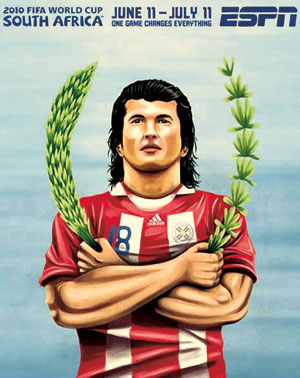 巴拉圭队的海报相比较而言实在是过于朴素了,作为该队的主力球员,巴尔德斯左右手分别握有棕榈和橄榄枝条,摆出了巴拉圭国徽的造型。如此低调作风,倒是恰如其分地诠释了这支南美球队所具有的特点。
