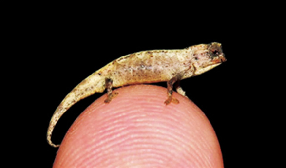 德国慕尼黑巴伐利亚国家动物园表示,他们在马达加斯加北部发现了两只成年微型变色龙,一雌一雄。其中雄性体长仅有22毫米,是目前已知爬行动物中体型最小的。另外一只雌性变色龙个头儿稍大,但总长也仅为29毫米。不过该新物种的生存环境令人担忧,这种变色龙的栖息地曾因森林砍伐遭到破坏,好在最近几年政府在当地规划了保护区,它们才得以幸运地存活下来。