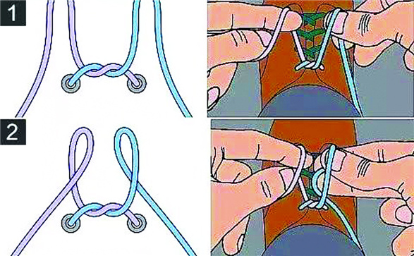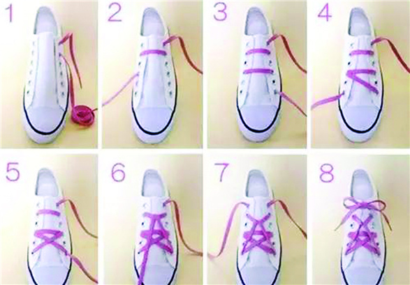 平常我们比较常采用的是交叉系鞋带法。这种系鞋带方法的优点是牢固,而且简单易上手。即使你是新手也能在几分钟之内学会其精华。由于交叉相压,因此这种方法也不容易导致鞋带松开(示意图如下)。