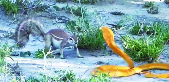 松鼠为保幼崽逼退眼镜蛇 日前,一则南非地松鼠大战眼镜蛇的视频流传网络。画面中,一条眼镜蛇入侵了松鼠的巢穴,松鼠为保护幼崽主动应敌。只见松鼠凭借灵动小巧的身躯来回躲闪,眼镜蛇数次攻击都被巧妙化解,双方一度陷入僵持中。松鼠则步步紧逼,眼镜蛇渐渐落入下风。随后,眼镜蛇不得不灰溜溜逃走。