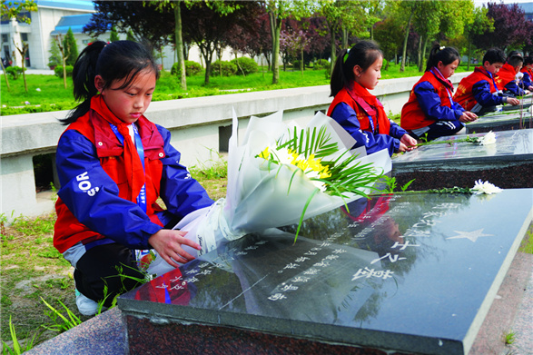 英雄逝去,但是他们的精神却像挺拔的松柏永远苍翠,永远激励着我们向前。下午,濉溪县南坪镇中心小学的学生记者们排着整齐的队伍踏上长长的廊道,拾级而上举目远眺,一面是安宁祥和的浩浩山河,另一面是默默守护这一方水土的忠魂烈骨。学生记者们怀着无比崇敬的心情瞻仰了“淮海战役烈士永垂不朽”纪念碑,向革命烈士敬献鲜花、敬少先队队礼,向长眠在这里的革命烈士默哀,表达内心的无限追思。