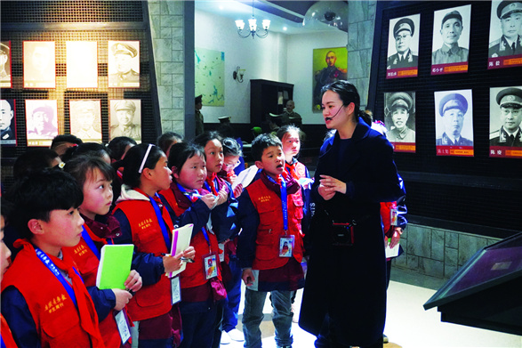 随后,在淮海战役双堆集歼灭战纪念馆内,讲解员张丹带领大家参观了战前形势、战役实施、人民支前等板块,详细了解这场承前启后的关键战役。“双堆集之战的始末是怎样的?”“这场战役的意义是什么?”“一共牺牲了多少战士?”面对学生记者们的提问,张丹姐姐为学生记者们一一解答:“双堆集地区歼灭战是整个淮海战役的第二阶段,前后23天,解放军中原、华东两大野战军并肩作战,经过阻击、包围、歼灭三个阶段的浴血奋战,在淮北市濉溪县双堆集地区歼灭了国民党精锐部队黄维兵团。双堆集之战,对于夺取淮海战役的伟大胜利,具有关键的意义。这也是人民解放军以伤亡3万余人的代价赢得的辉煌战果。”在张丹姐姐的讲解下,学生记者们重温了当年那段可歌可泣的革命历史。
