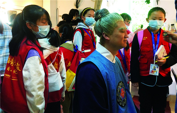 房间的西南角,是几位饰演白骨夫人手下的演员。身穿白粉渐变的丝质阔腿裤,披着纱衣,头戴专用头饰。化上妆后,一位花容月貌的秀气小娘子映入眼帘。小记者们纷纷向演员提出了问题,演员们耐心地一一解答了。