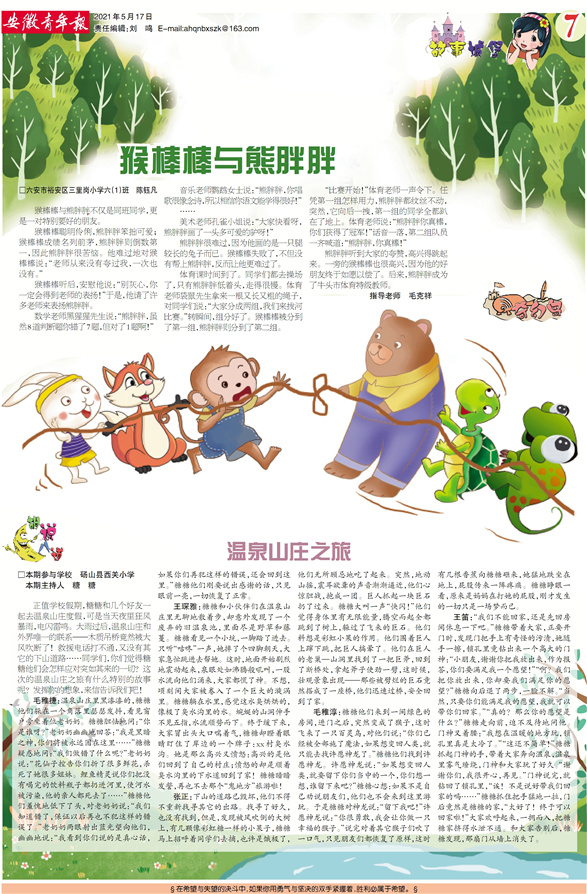 奇幻岛 猴棒棒与熊胖胖 □六安市裕安区三里岗小学六(1)班 陈钰凡 猴棒棒与熊胖胖不仅是同班同学,更是一对特别要好的朋友。 猴棒棒聪明伶俐,熊胖胖笨拙可爱;猴棒棒成绩名列前茅,熊胖胖则倒数第一,因此熊胖胖很苦恼。他难过地对猴棒棒说:“老师从来没有夸过我,一次也没有。” 猴棒棒听后,安慰他说:“别灰心,你一定会得到老师的表扬!”于是,他请了许多老师来表扬熊胖胖。 数学老师黑猩猩先生说:“熊胖胖,虽然8道判断题你错了7题,但对了1题啊!” 音乐老师鹦鹉女士说:“熊胖胖,你唱歌很像念诗,所以相信你语文能学得很好!” …… 美术老师孔雀小姐说:“大家快看呀,熊胖胖画了一头多可爱的驴呀!” 熊胖胖很难过,因为他画的是一只腿较长的兔子而已。猴棒棒失败了,不但没有帮上熊胖胖,反而让他更难过了。 体育课时间到了。同学们都去操场了,只有熊胖胖低着头,走得很慢。体育老师袋鼠先生拿来一根又长又粗的绳子,对同学们说:“大家分成两组,我们来拔河比赛。”转瞬间,组分好了。猴棒棒被分到了第一组,熊胖胖则分到了第二组。 “比赛开始!”体育老师一声令下。任凭第一组怎样用力,熊胖胖都纹丝不动,突然,它向后一拽,第一组的同学全都趴在了地上。体育老师说:“熊胖胖你真棒,你们获得了冠军!”话音一落,第二组队员一齐喊道:“熊胖胖,你真棒!” 熊胖胖听到大家的夸赞,高兴得跳起来。一旁的猴棒棒也很高兴,因为他的好朋友终于如愿以偿了。后来,熊胖胖成为了牛头市体育特级教师。 指导老师 毛克祥
