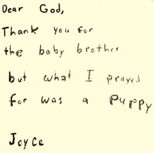 亲爱的上帝,谢谢你给我带来一个小弟弟,但我祈祷的是一只小狗狗。——Joyce