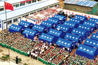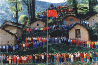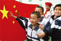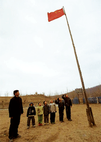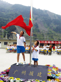 让我们把国旗高高升起 这是汶川县映秀小学在同学们复课后首次升旗仪式。在“5·12”地震后,这里作为震心,受了重创,在全国各地叔叔阿姨的帮助下,同学们在灾后得以顺利开学。