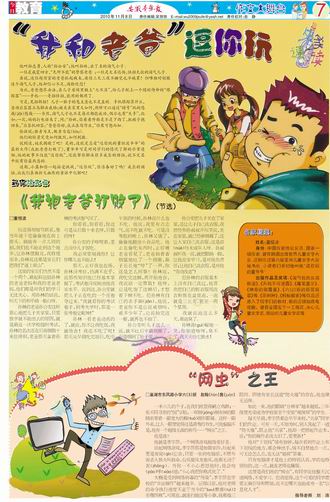 “网虫”之王 □巢湖市东风路小学六(3)班 赵翰(hàn)隽(juàn) 一米六几的个子,在我们班显得鹤立鸡群;一张不同寻常的“国”字脸,一双炯(jiǒnɡ)炯有神的眼睛前架·着一副宽大的椭(tuǒ)圆形眼镜。这样一副外表,让人一眼便觉得这是清秀的书生,可他偏偏不是,他有一个超级无敌的称号——“网虫”之王。 他是谁? 他就是季宇昂,一个网络游戏超级爱好者。 谈起网络游戏,季宇昂那是如数家珍,玩起来更是废寝(qǐn)忘食,只要一坐到电脑前,不管外面杀人放火叫救命,台风旋风龙卷风,他都无动于衷(zhōnɡ)。当你一不小心惹怒他时,他会咆(páo)哮(xiào)道:“小心我把你格式化了。” 大概是受到网络病毒的“传染”,季宇昂在学校的“非法操作”越来越多。记得以前,他对老师的命令执行速度不亚于当今的“Intel酷睿(ruì)2至尊四核”,可现在,就连扫地这等小事,他都推三阻四。即使有家长这道“防火墙”的存在,他也肆无忌惮。 如此一来,他的眼睛“分辨率”越来越低,三年级便光荣成为学校里首个安装“视保屏”的学生。 每天早晨,季宇昂都会早早来校,“共享”同学们的作业。可有一天,不知为何,别人筑起了一道“防火墙”,阻止他“共享”,他却一把捞起作业本,说:“你的操作系统太旧了,要更新!” 他对“下划线”情有独钟,每次看到作业上有下划线的地方,都会伸出手,情不自禁地点一点,可无论怎么点,也无法“链接”答案。 只有电脑课才是他上的特别认真,学的也特别快的,这一点,就连老师也佩服。 这便是我们班的“网虫”,有同学说他整天沉迷网络,不爱学习。但我觉得,这个可爱的同学需要正确引导和管制,说不定哪天也能成为一名“信息化人才”。 指导老师 刘 沛