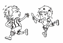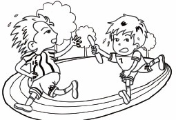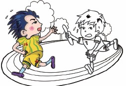 4.补上这个男孩的下半身外,给他们的服装做些修饰吧。添上些汗珠就更加生动形象了! 5.画出环形的跑道及远处的大树,初稿就竣工了。 6.继续保持耐心,先来给16号队员上色吧。