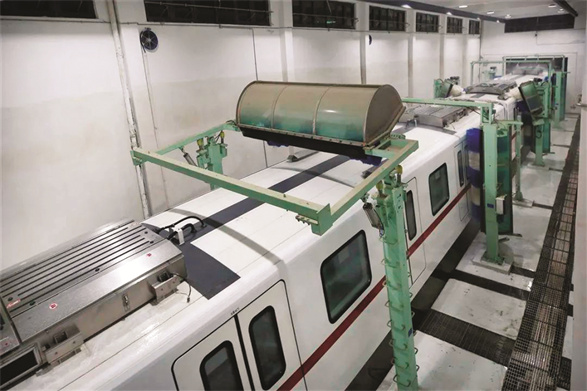 列车驶过端洗区域后,顶刷、侧刷、弧刷、喷淋就开始依次启动。侧刷和弧刷分别用于对列车的侧面及“肩部”进行刷洗。