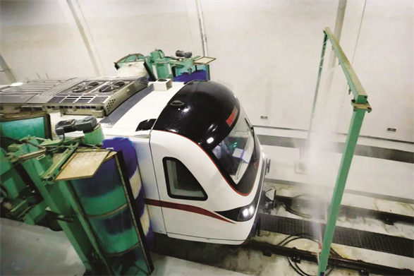 地铁列车清洗时,会以每小时3千米的速度缓慢驶入“浴室”。首先,预冷机构会在列车进库时对车体进行循环水喷淋,提高车体的湿润性,增强洗涤效果。