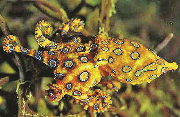 蓝环章鱼因身体上鲜艳的蓝环而得名。它会变色伪装在潮间带海域,体表本为黄褐色,遇到危险时,身体上深色的环就会发出耀眼的蓝光。别看它个头小,分泌的毒液却足以在一次啮咬中就夺人性命,是已知的剧毒海洋生物之一,更可怕的是,目前尚无解毒剂。
