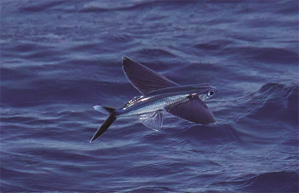 鱼儿在水中如果遇到敌人都是尽力快速游动逃走,可你见过逃到飞起的鱼吗?飞鱼长相奇特,胸鳍(qí)特别发达,像鸟类的翅膀一样。长长的胸鳍可一直延伸到尾部。凭借流线型的优美体型,飞鱼可以在海中以每秒10米的速度高速运动。它能跃出水面几米,并在空中停留40多秒。当遭到敌害威胁,或者受到轮船惊吓时,飞鱼才会快速游动助跑,然后冲出水面,用胸鳍做一段滑翔,飞鱼摆动的尾部为其滑翔提供动力。