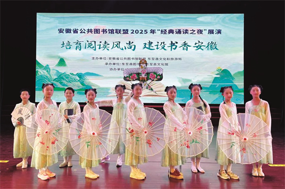 一周快报 太湖县新城小学 闪耀“经典诵读之夜” □王四平 近日,安徽省公共图书馆联盟“经典诵读之夜”展演活动在池州市东至县举行,太湖县新城小学学生表演的节目——《诗意春天》在活动中精彩亮相。展演现场,同学们身着传统服饰,以纯净童声与经典诗词展开对话。从“碧玉妆成一树高”的春柳之姿,到“润物细无声”的春雨之韵,再到“忙趁东风放纸鸢”的春日之趣,他们声情并茂、动作灵动,完美诠释诗词意境,赢得现场观众热烈掌声。此次活动让经典焕新,也激发了同学们传承传统文化的热情,未来学校将持续开展文化活动,让经典浸润校园。