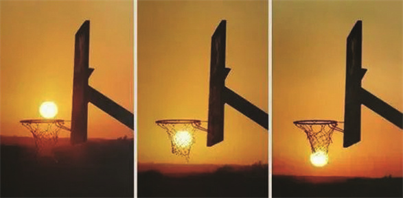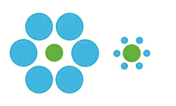 两个绿色的圆,看上去右侧的要大些,其实一样大。 两条红色的平行线,在特定的背景下,感觉中间鼓起来了。 外框都一样大,但内部笔画越多,感觉外框越大了。 上述的这些错觉,都是由于参照物不同而造成的。太阳在地平线附近时,由于是和建筑物、树木等作对比,所以感觉要大些;到了天空中,没有了参照物,就感觉太阳像是变小了。