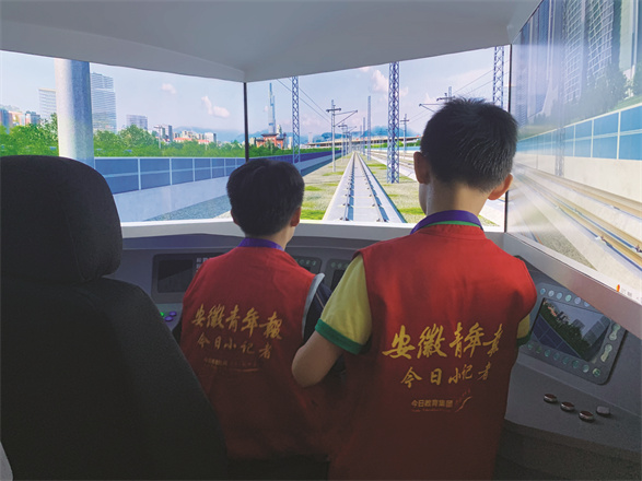 经过全程参观和讲解员的详细讲解,学生记者们对劳模精神有了更深刻的理解。为进一步领略工匠魅力,他们早已迫不及待地穿梭于各个互动体验区。在高铁模拟驾驶舱内,学生记者郗晓曼握紧操纵杆,随着“发车”指令,虚拟高铁瞬间提速,轨道摩擦声骤然响起。“窗外的景色像闪电一样!”她双眼发亮,兴奋的呼喊声与模拟引擎的轰鸣声交织在一起。