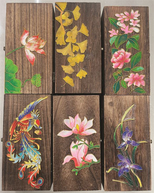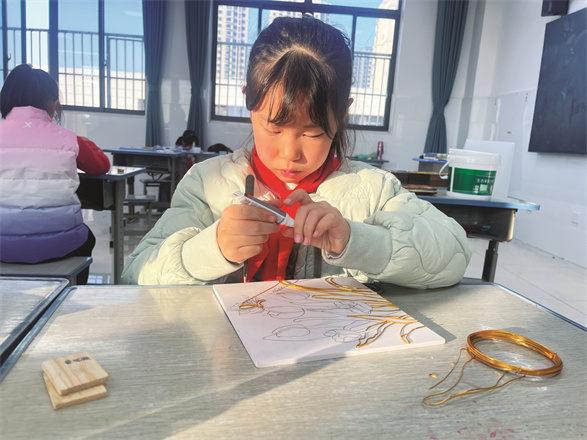 据了解,2021年,学校非遗金丝砂画社团诞生,最初社团有17名成员,如今已壮大到30人。每周三、周四下午第三节课,是社团队员最盼望的活动时间。在活动室,大家先听老师讲掐丝珐琅的历史,了解这门古老技艺的前世今生,接着就开启创作之旅,用细细的铜丝掐出各种图案,蝴蝶翩翩、雄鹰展翅,在指尖渐渐成型,再用彩色珐琅釉料或彩砂填充颜色,一幅幅作品诞生啦。