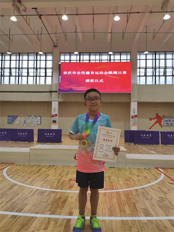 拿到“安庆绳王”奖时,我的手心还在冒汗,但心里特别踏实。比赛最后一分钟,我听到队友和老师喊我的名字,突然想起训练时受过的伤、数过的绳响,还有老师们被夕阳拉长的影子。最终大屏幕的数字定格在962,我赢了!这个奖其实是一群人的“接力赛”:是爸爸换掉我断掉的钢丝绳,是同学帮我补习上训练耽误的功课,是老师用休息时间陪我加练的每一分钟。