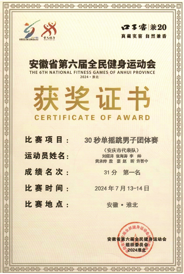 安徽省第六届全民健身运动会跳绳比赛30秒单摇、双摇、1分钟一带一单摇男子团体赛第一名