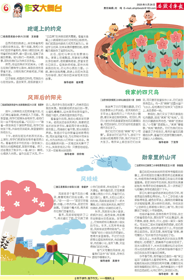 我家的四只鸟 □合肥市师范附属第三小学华山路校区四(1)班 王树泽 我家养了四只可爱的鹦鹉,它们的故事要从去年说起。那天妈妈在二手平台上看到两只三个月大的小鹦鹉,便买来送给我和妹妹。初见时,两只小家伙在纸盒里紧张地叽叽喳喳叫着,可回到家时,它们已经在纸盒里玩得不亦乐乎了。 我们给它们取名“啾啾”和“小可爱”。卖家说它们还不会飞,谁知下午就溜出纸箱满屋子跑,我们只好买了大笼子。每天早上都会放它们出来玩,可只要在笼里放些小米,它们就会乖乖回去。有一次“啾啾”试图从窗户飞出去,但怕高的它很快又飞回我手上,真是虚惊一场。 寒假时,我们又买了两只漂亮的牡丹鹦鹉,取名“笑笑”和“桃桃”。现在四只鹦鹉各具特色:“啾啾”活泼好动,“小可爱”温顺黏人,“笑笑”爱唱歌,“桃桃”最贪吃。它们为我们的生活增添了许多欢乐,每天听着叽叽喳喳的叫声,看着它们活泼可爱的模样,总能让人心情愉悦。 指导老师 丁亚萍