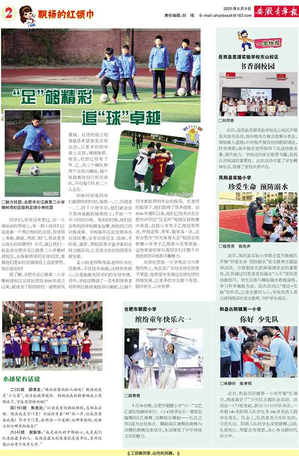 二(3)班 邵博文:“踢足球像玩抓人游戏!教练说我是‘小火箭’,因为我跑得超快。妈妈说我的脸蛋晒成小黑煤球了,可我觉得特别酷!”