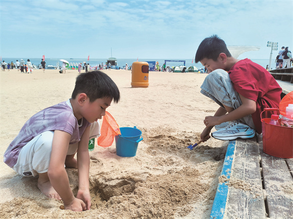 在大沙湾的沙滩玩沙子才叫好玩呢!沙子松松软软的,抓一把在手里,它就从指缝里溜走啦,像调皮的小鱼。我和哥哥堆沙堡,他用小铲子把沙子堆成小山,我就往上面插贝壳当窗户,妈妈还帮我们找来小树枝做城门。