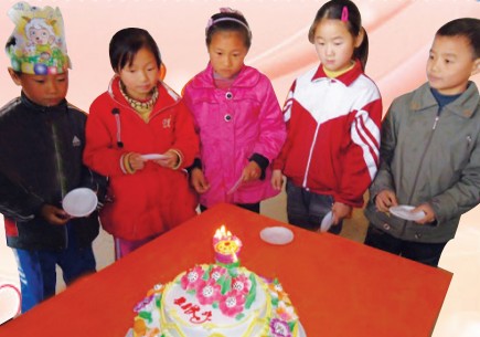 原来,今天有同学过生日!走近一看,还是五位“小寿星”呢!他们分别是张佳宇、马靖雯、尚居、李静、秦梦冉。这五位同学不仅生日 同一天,而且都是留守未成年人,于是,学校精心为大家准备了一个特别的生日PARTY。
