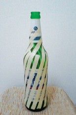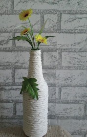 你家里有空瓶子么?赶快拿来改造成花瓶吧。哪怕是一个普普通通的啤酒瓶,只要换上新装,也可以变成田园味十足的优雅花瓶。 1先把空啤酒瓶洗干净,然后在瓶身贴满双面胶。