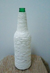 2用卷纸搓成“麻花”,揭下双面胶的胶纸后,仔细地用纸裹住瓶子。