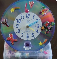 废弃的光盘、磁带盒,精致的小贴画和指针,这几样毫不相干的废弃物在她的手里就变成了一台精巧的小时钟。只需一节电池,指针就会“滴答滴答”地走动。