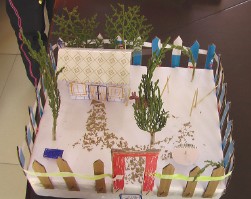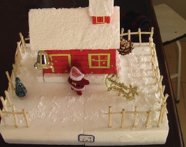 泡沫板做雪地,涂色的纸板裁成栅(zhà)栏和院门,硬纸做成房子,彩色手工纸做屋顶,在“雪地”上插上松树枝和牙签。一座安静祥和的农家小院出现在了眼前。