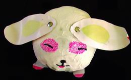 用纸片剪成耳朵和脚,再用图钉固定在相应的部位。最后用彩笔画出小兔子的眼睛、嘴巴和鼻子。