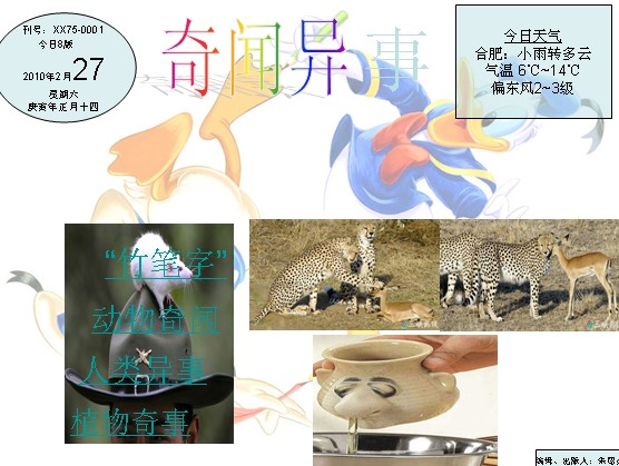 这是一份用电脑制作出来的报刊读物,主题是“奇闻异事”,里面介绍了全球各地很多有趣而奇怪的事情,有动物、植物,也有人类,可丰富了。朱珺炎不仅按照报刊的要求把它们用自己的语言组织出来,还配有清晰的图片解析。为了让它们更形象生动,他除了使用超链接之外,还运用了不少动画效果。