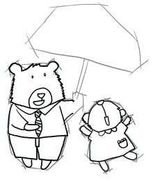 处处为别人着想,你会发现,关键时刻别人也在想着你。 1.这幅图的框架很简单,相信你一定会完成得很顺利。 2.画出清晰的线条,处理好面部的表情:熊爸爸一脸关爱,熊女儿则很开心。 3.完成所有绘画的内容,擦去草稿部分。 4.该上色了,这幅简单的图你一定会轻松搞定的。 5.画面简单也马虎不得,就像父母做的虽是小事,但他们给的是满满的爱心。 |