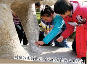 明皇陵的正门被修成了城墙的形状,门楼上写着“明皇陵”三个金光闪闪的大字,十分气派,灰砖与墙内的“绿意”相映成趣。走过一段台阶,我们踏上青石板及由多彩鹅卵石铺成的龙麟(lín)纹神道。鹅卵石好似龙麟,当年这可是皇家陵园,不是所有人都能够进出的!——陈嘉垚(yáo)