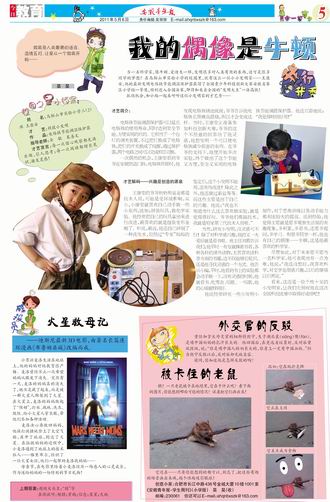 他说经常研究一些小发明小制作,对于思维训练以及动手能力都有比较大的提高。说到经验,他觉得主要就是要多观察生活里的有趣现象,多积累,多看书,还要多提问,多学习。和很多同学一样,他也有自己的偶像——牛顿,这是他最喜欢的科学家。