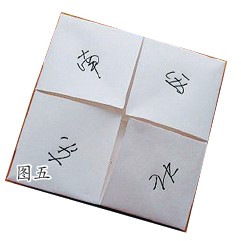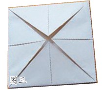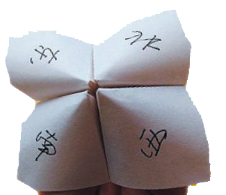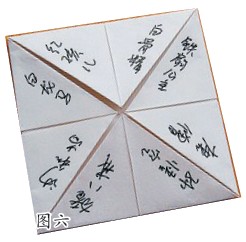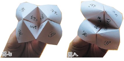 大家好!我是你们的朋友圈圈。 我个性活泼、爱玩爱闹,在我的百宝箱里,装了很多稀奇古怪的东东哟! 不信,我告诉你们! 我这个百宝箱里呀,有好玩的游戏、好吃的零食、好看的卡通片……应有尽有。不管是现在流行的,还是你们爷爷奶奶、爸爸妈妈那时候流行的,我都知道哦! 如果你们有什么好玩的东西、有创意的点子,就赶快跟我联系吧!说不定下一期就能刊登在我们报纸上咯! 初次见面,我带你们去学个简单的、用一张纸就能做成的小玩意。 你们见过这个吗?是不是特像一朵花?其实,在你们爸爸妈妈那个年代,这可是特别流行的一个课间游戏,人们一直称它为“东南西北”。 你可别小瞧了这个东西,在“东”、“南”、“西”、“北”每个字的后面可是藏了很多秘密呢! 我们先来看看这个是怎么做出来的吧! 首先,取一张两面全白的正方形纸,左右、上下各对折一次,然后展开,形成一个“田”字,将正方形纸的四个角对折进去,在中心点汇拢。(如图一) 四个角都折好后,形成一个新的正方形,然后整个儿翻过来。(如图二) 把角对准中心折进去,四个角都折好后,再形成一个新的正方形。(如图三) 翻过来,把对角线往里折,中间的十字交叉线向外折。(如图四) 在四个角正面写上“东”、“南”、“西”、“北”四个字。(如图五) 背面写一些人物的名字,如警察、孙悟空、公主之类的,就大功告成了。(如图六) 道具做好后,你就可以决定别人的“命运”了。 将“东南西北”套在左、右手的大拇指和食指上,使四个顶角聚拢在一起,让你的小伙伴先选择“东南西北”中的一个方位,再选择“开”的次数和方式。 “开”就是保持两两正方形并在一起,然后与另两个正方形分开。比如“横开”,就是保持左面和右面的上下两个正方形分别并在一起,交替“横开”(如图七)和“竖开”(如图八),直到次数达到预先要求。再在开口处对应的“东南西北”字下属的三角形上,看到对方“将来的命运”。 同学们,你们学会了吗? 这个游戏好玩的地方就是藏在“东南西北”每个字底下的神秘人物。 如果你也想试试,就动手做一个吧!在你的小伙伴面前露一手,看看你的小伙伴是“孙悟空”还是“白龙马”!