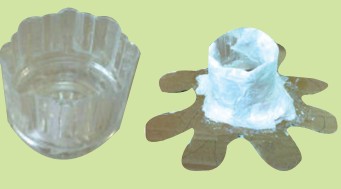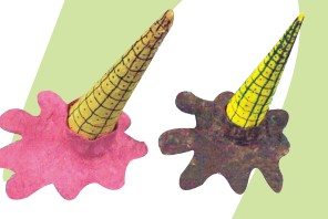 接下来,一边刷上稀释了的乳白胶,一边粘上面巾纸。至少要粘两层,特别在底部要多粘一些纸,形成冰激凌流出来蔓延的效果。粘好面巾纸的底座就出来了!瞧!三个“蛋筒”,像三顶“高帽”。
