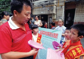 话说校园 我是小小推普员 □彭 超 9月11日,第14届全国推广普通话宣传周的第一天,本届“推普周”的宣传主题是“提升国家通用文字应用能力,弘扬中华优秀文化传统”。蚌埠市第一实验小学的小小推普志愿者们和老师一起走进青年社区,纷纷当起了推普员。瞧,设立推普活动站,挂起宣传条幅,摆放宣传展板,小推普员们早就各自忙开了,一点也不怠慢。在社区门口,他们正不停地向过往路人发放推广普通话倡议书呢。 小推普员们的积极热情引来了群众们的驻足,前来打听的居民一边听讲解,一边点头。他们有的耐心地倾听孩子们的普通话讲解;有的还饶有兴致地现场跟着推普志愿者们学起了普通话……现场氛围好不热闹! 不仅如此,社区里的叔叔阿姨、爷爷奶奶还表态了呢:我们要与孩子一起,说好普通话,用好文明语,做个文明人!