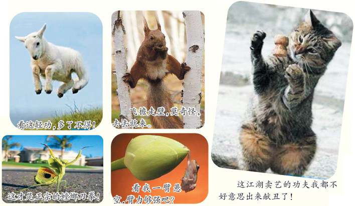 紧急通知:近期,有大批武林高手潜入我们身边,甚至还包括一部分动物,它们都有各自的绝招。如果给它们戴上拳击套、护腕、护膝,再配把宝剑的话,说不定很多武林中人还不是它们的对手呢! 看看网上发布的通缉令,可不能小看它们啊!如果你发现它们,记住哦,它们可都是武林高手!