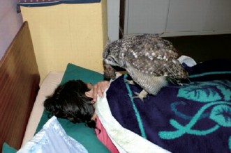 “恩人,快醒醒,我给你带好吃的了!快醒醒,你不认识我了吗?我是你四年前救起的猫头鹰啊!”