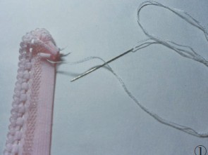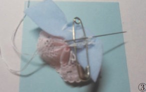 二、用褶皱法将蕾丝折起来,再把穿好的针插进去。(如果不会的话,也可以像缝衣服那样,将针一点一点的插进去。然后,顺着针头把缝好的蕾丝往下捋(lǚ),捋成像扇子一样的褶皱型!)