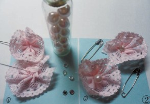 材 料:剪刀(危险物品,小心使用)、别针、衣服上的水晶钻、胶水、蕾丝花边、针、白色的线