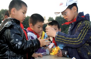 话说校园 淘淘乐里寻宝贝 □胡 玲 丁文进 本报记者 黄丽娟 “瞧一瞧,看一看;走过路过,千万别错过;本店物品物美价廉又实惠啦!”没错,你没听错,这欢快的吆喝声来自合肥市朝霞小学。11月25日下午,三(3)班学生祝筱恬抱着一堆淘来的玩具和书籍,兴奋地告诉小J:“我们学校首届红领巾淘宝节开始了,看,这些全是我的战利品。” 小J好奇地来到了淘宝现场,瞬间就被琳琅满目的物品摊位所吸引,这些摊位都有着好听的名字:六一梦幻屋、红叶李小站、童真童趣小店等等。“顾客”站在自己喜欢的小店铺旁,熟练地跟“推销员”讨价还价,整个校园俨然一个小闹市。一家名叫精品小栈的店铺外站满了“顾客”,店长刘雯琪同学正在卖力地吆喝。 面对盛况,学校校长彭正告诉小J:“活动中,孩子们既淘到了自己喜爱的物品,又树立了低碳生活、绿色生活的理念,同时还让大家在淘宝活动中学会了与人交流、沟通。”